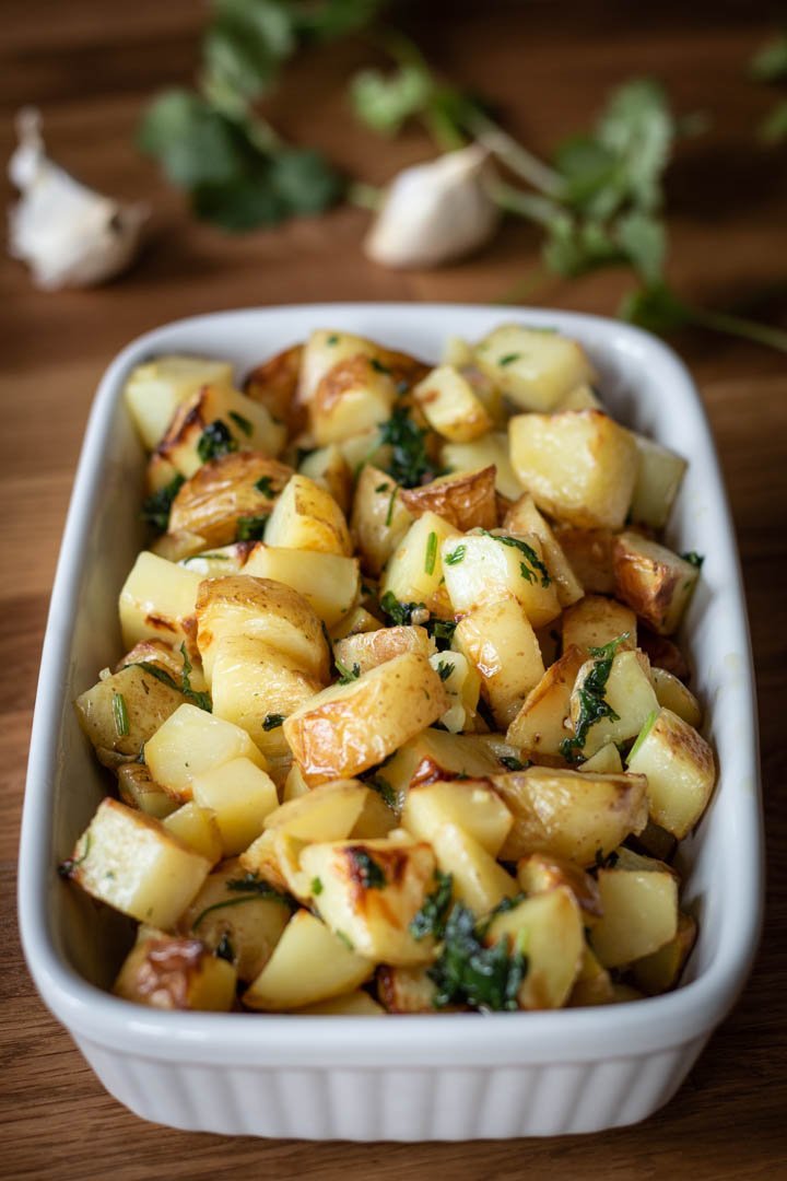 Die Kartoffeln selbst bereiten wir übrigens im Ofen zu, statt sie zu frittieren oder in (viel) Öl zu braten – Knoblauch und Koriander kommen dann erst kurz vor dem Servieren dazu.