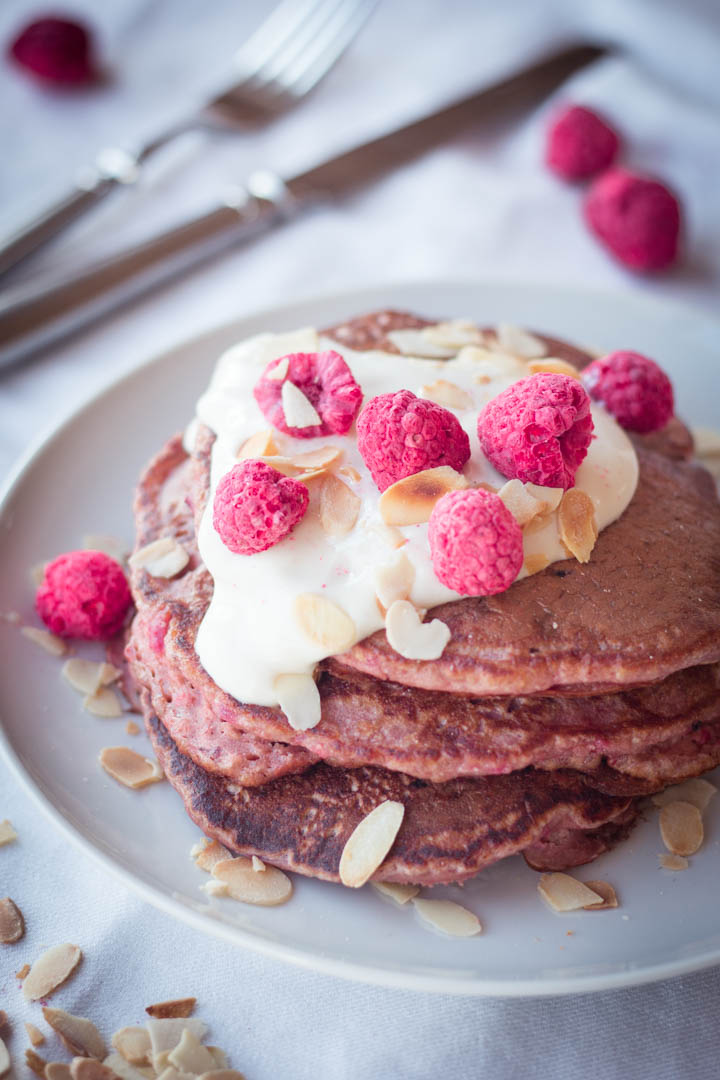 Anstelle von Himbeeren kannst du natürlich auch jede andere Beerensorte nehmen. Blaubeeren stelle ich mir sehr gut vor, oder die leckeren Brombeeren, die du momentan auch super selbst pflücken kannst. Zum Verfeinern eignen sich gehackte Nüsse, Schokostückchen, Kakaopulver, Zimt, Kakaonibs und natürlich der Pancake-Klassiker Ahornsirup. Lass es dir schmecken!