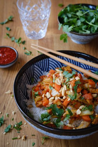 Abschmecken und je nach persönlichen Vorlieben noch etwas Sambal Oelek, Sojasoße oder Ahornsirup dazugeben. Zusammen mit Reis in Schalen anrichten und mit frischem Koriander und gehackten Erdnüssen garnieren.